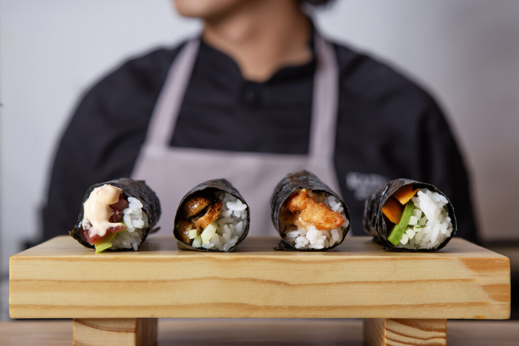 En nuestra taberna japonesa la propuesta gastronómica gira en torno a la barra, donde los comensales pueden ver de cerca el arte de la elaboración de los hand rolls.