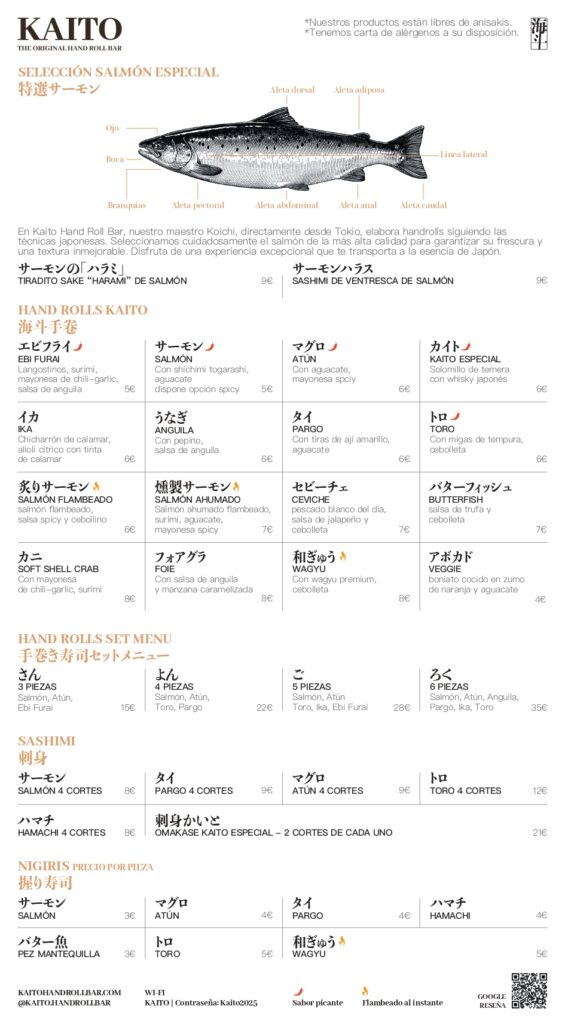 Inspirado en los Hand Roll Bars de Tokio, en Kaito la experiencia gira en torno a la barra donde elaboramos cada pieza al momento, delante del comensal y asegurando la máxima frescura y calidad en cada bocado.